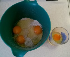 Egy nagyobb tálba kimérem a zablisztet. (Ha épp nincs itthon, akkor diódarálón ledarálom a zabpelyhet.) Hozzáadom a tojásokat, a tejet és a szódát, megsózom, teszek bele egy kicsi paleo cukrot (vagy valami más édesítőt), és elektromos habverővel elkeverem. Egy kevés olajat is rakok a tésztába.