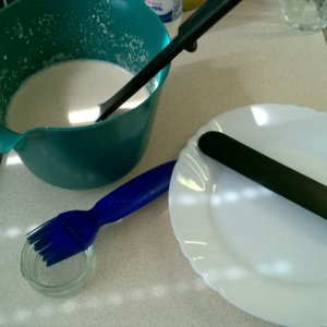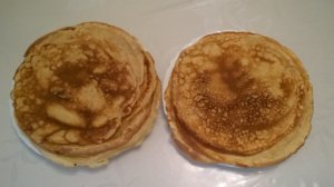 A palacsintasütőt elkezdem nagy lángon melegíteni, amíg melegszik előveszek egy lapos tányért, amibe a kész palacsintát teszem, kikészítem a merőkanalat, a teflon palacsinta forgatót, a szilikon ecsetet, és egy kicsi tálba olajat.