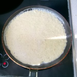 Ha forró a palacsintasütő, akkor szilikon ecsettel kikenem olajjal, egy merőkanál tésztát teszek a serpenyőbe, és laza csuklómozdulattal egyenletesen szétterítem. (A tésztát mindig felkeverem a merőkanállal, mert leülepszik a sűrűje. Ha nagyon csomósodik, akkor elektromos habverővel keverem még egy kicsit.) Ha nagyon vastagnak találod a palacsintát, akkor kevesebb tésztát tegyél a serpenyőbe.