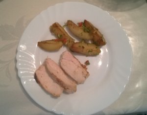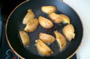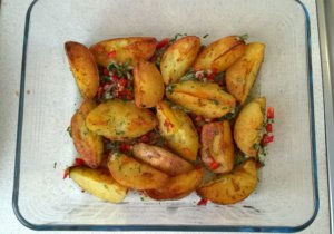 Amikor megsült a burgonya kiveszem a sütőből, egy deszkán villával lefogom, és héjastól nagyobb cikkekre vágom. Közben egy serpenyőben kevés olajat melegítek. A krumpli cikkeket nagy lángon megpirítom, és még forrón beleteszem a pácba. Hagyom langyosra hűlni, addig egy kis páclét magába szív. Nagyon finom pl. rántott hússal, joghurtos bundában sült csirkemellel, sült oldalassal, sajtos-tejfölös sült csirkemellel, sajtba panírozott csirkemellel, mézes-mustáros joghurtban pácolt csirkemellel stb.