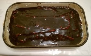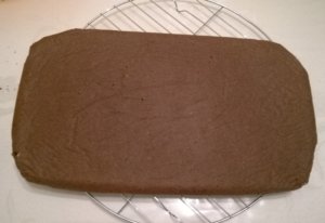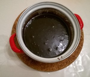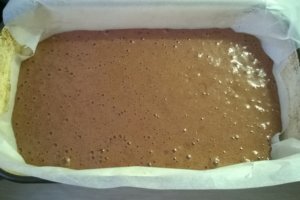 Elkészítem a csokimázat. A vajat szintén vízgőz fölött felolvasztom, belekeverem a cukrot, kakaót és tejet. Simára keverem, kicsit hűtőm, és a langyos mázat ráöntöm a habra. Óvatosan minden hova kell, mert nem nagyon lehet korrigálni. Kicsit hagyom dermedni. (Esetleg érdemes a hűtőbe tenni.)