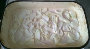 A sütőt előmelegítem kb. 170 fokra, közben amíg melegszik a sütő a hagymákat megpucolom, a vöröshagymát félholdra, a fokhagymát szeletekre vágom. Beleteszem egy tepsi aljába, és annyi vizet öntök rá, hogy épp ellepje a hagymákat.