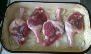 A combokat megpucolom az esetlegesen rajta maradt tollaktól, tokoktól, sózom, és frissen őrölt borsot szórok rá. Ráteszem a hagymára úgy, hogy ne érjenek egymáshoz.