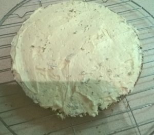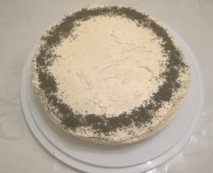 Ha megsült a torta kiveszem a sütőből, rácson hagyom kihűlni. Három részre vágom, a krémet három felé osztom és megkenem a lapokat. A külsejét is bevonom a csokis krémmel. Mivel én nem nagyon tudok tortát díszíteni egyszerűen a szélét körbe szórom darált mákkal.
