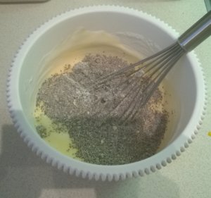 A fehérjét nagyobb tálba teszem, és a „cukorral” kemény habot verek. Hozzáadom a tojássárgáját, és apránként a mákos lisztet. Ekkor már csak kézi habverőt használok, hogy ne törjön össze a hab.Beleöntöm a tortaformába, és betolom a sütőbe.