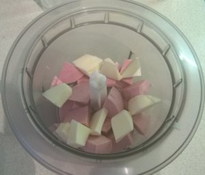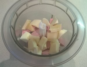 A párizsit, a hideg vajat és a szeletelt sajtokat összekockáztam beraktam az aprítógépbe,pici fehér borssal ízesítettem és egyszerűen pépesre kevertem. Közben tejszínnel lazítottam.