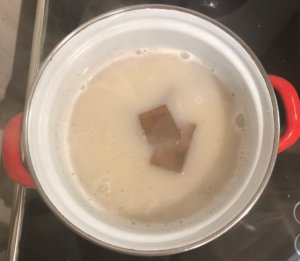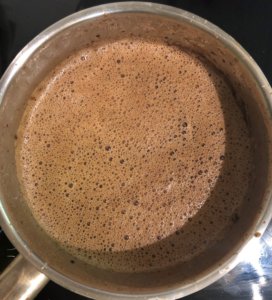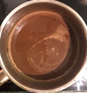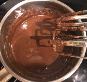 A 2,5 dl tejet a vaníliával és a 30 gr cukorral felforralom. A meleg tejben felolvasztom a csokit.