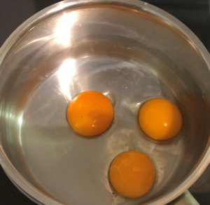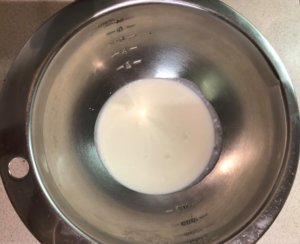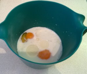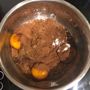 Amíg melegszik a tej, addig a tojássárgáját a cukorral, kakaóval, 20 gr liszttel és az 5 cl hideg tejjel habverővel simára keverem.