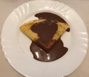 Az elkészült palacsintát megkenem diókrémmel, háromszög alakúra hajtom, majd meglocsolom csokiszósszal. Eredetileg kivajazott tepsiben néhány percre be kellene rakni a sütőbe, de én nem szoktam.
